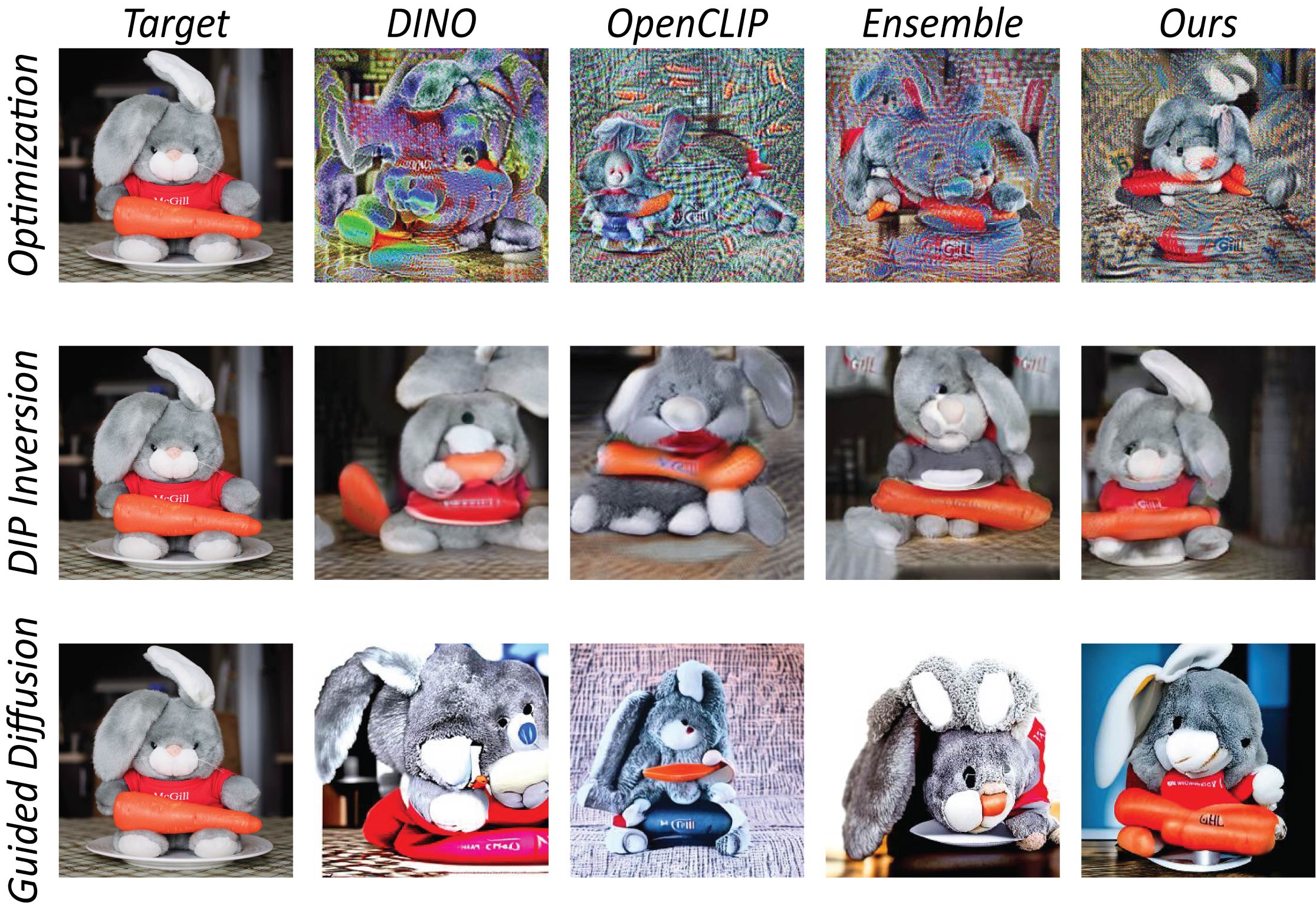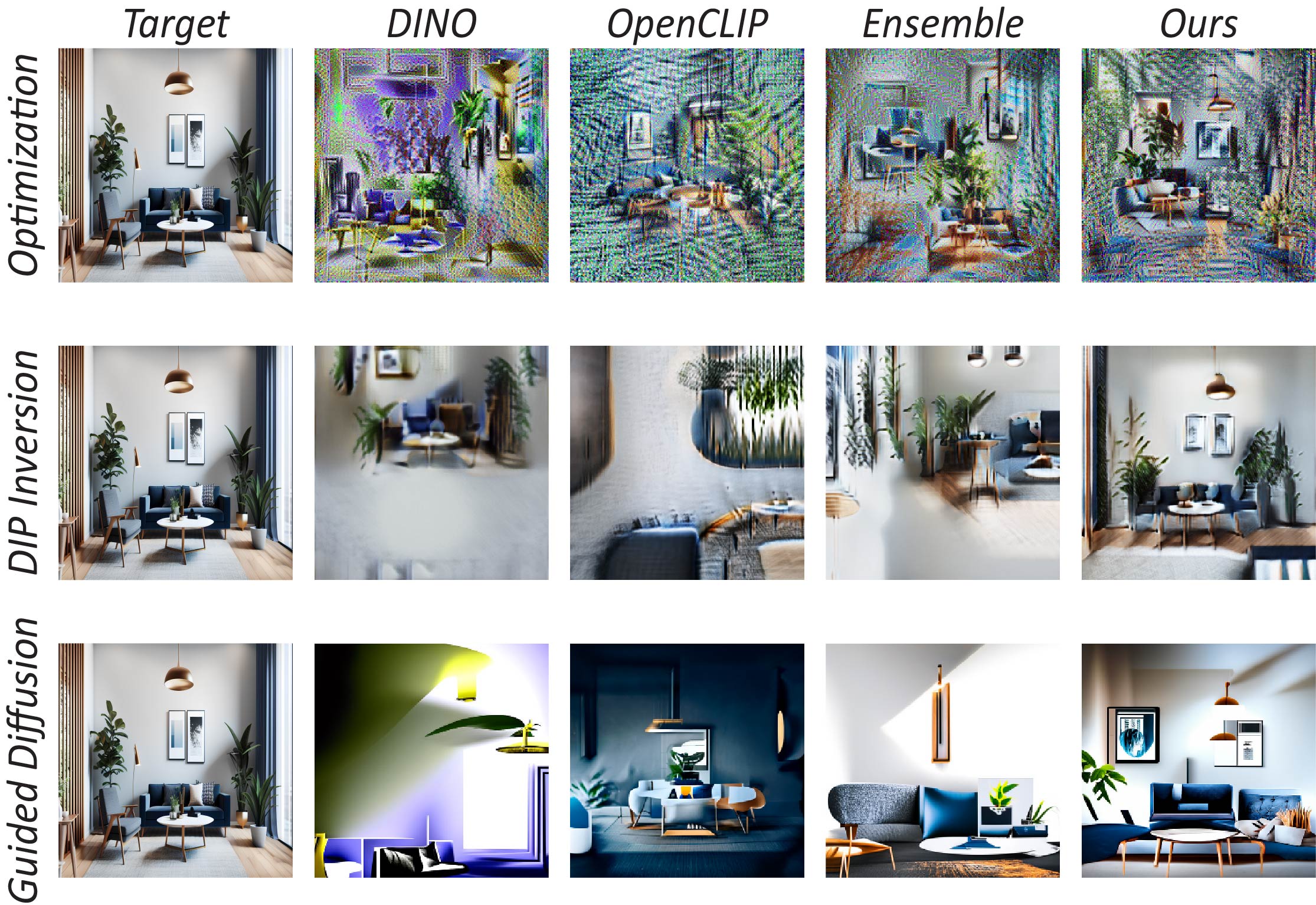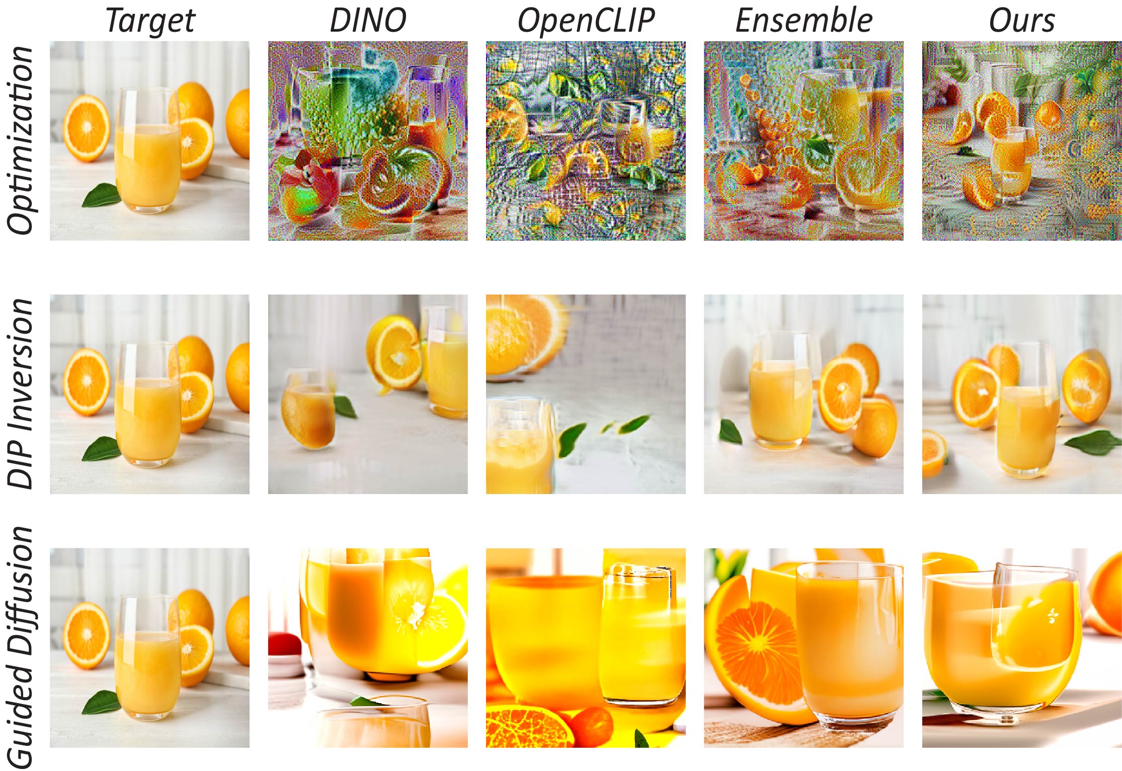 Without any image prior (Optimization), our metric recovers better the color, shape and semantics