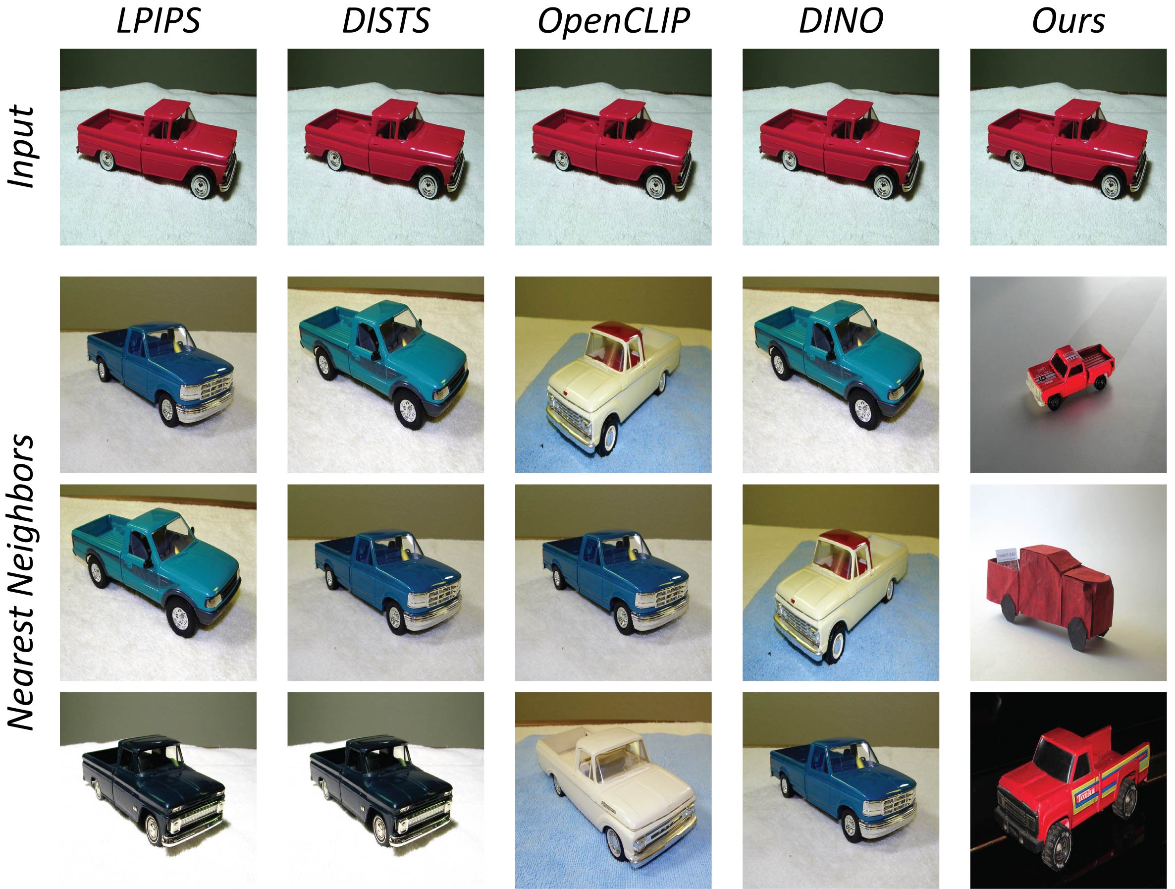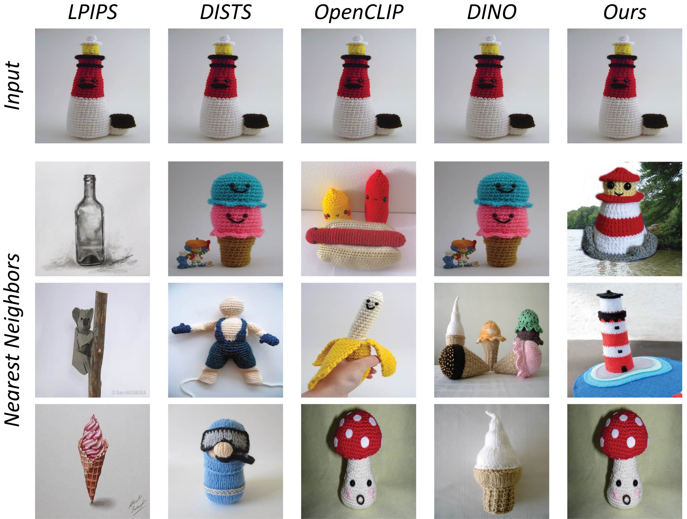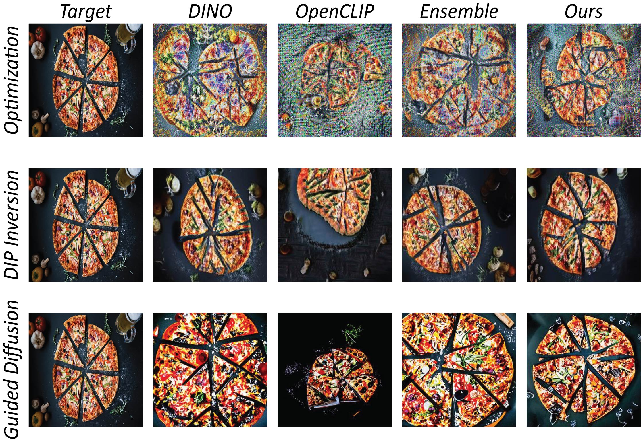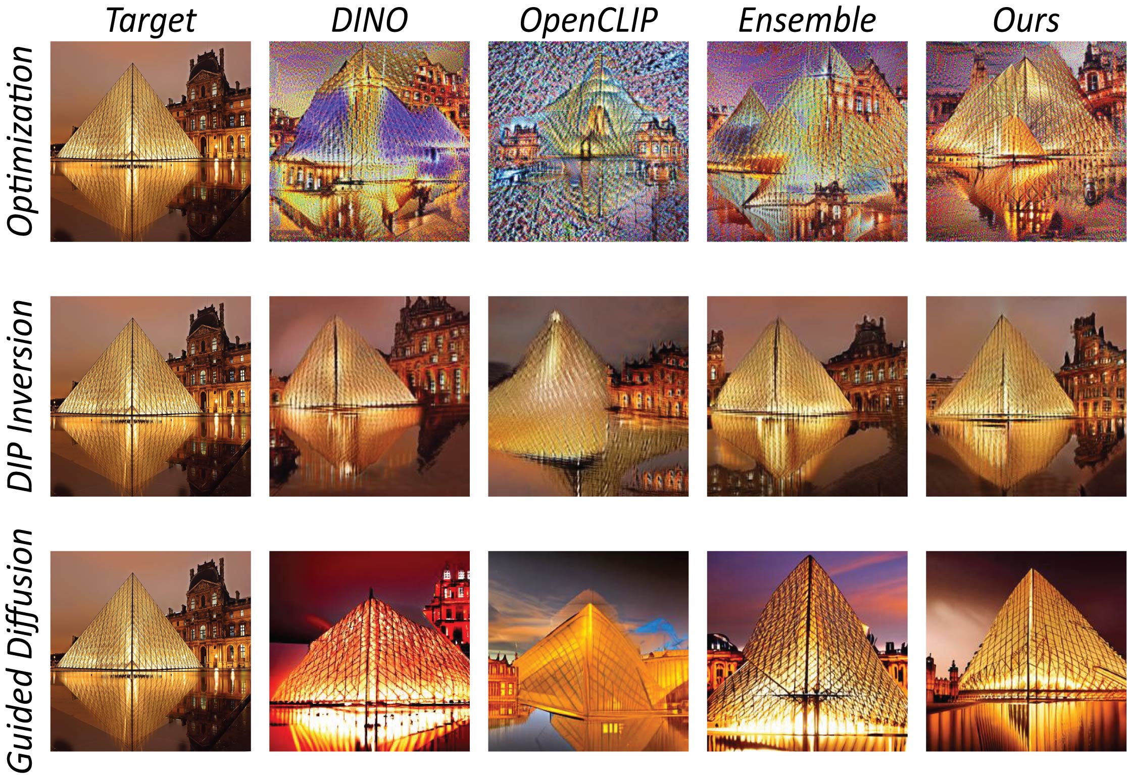 Without any image prior (Optimization), our metric recovers better the color, shape and semantics