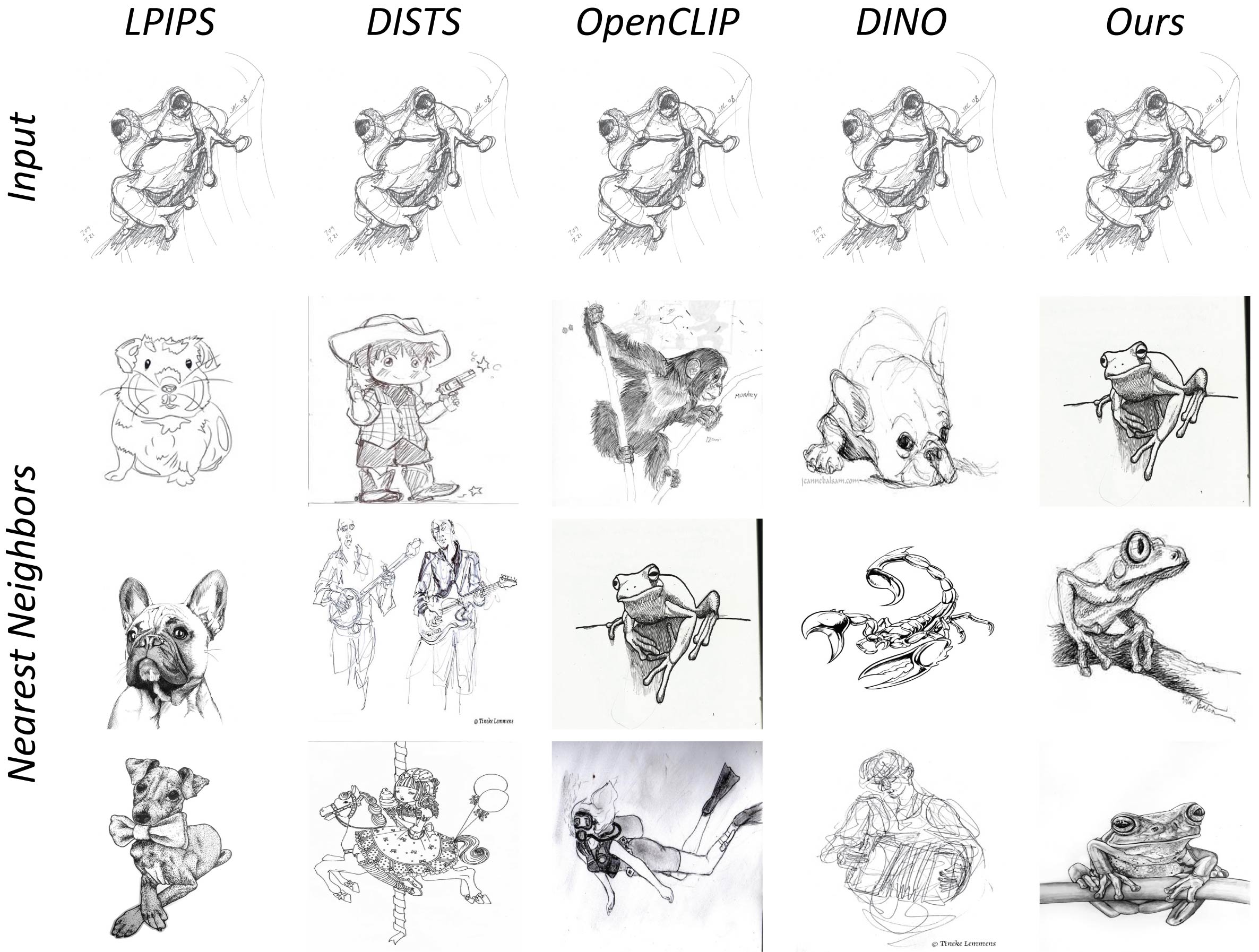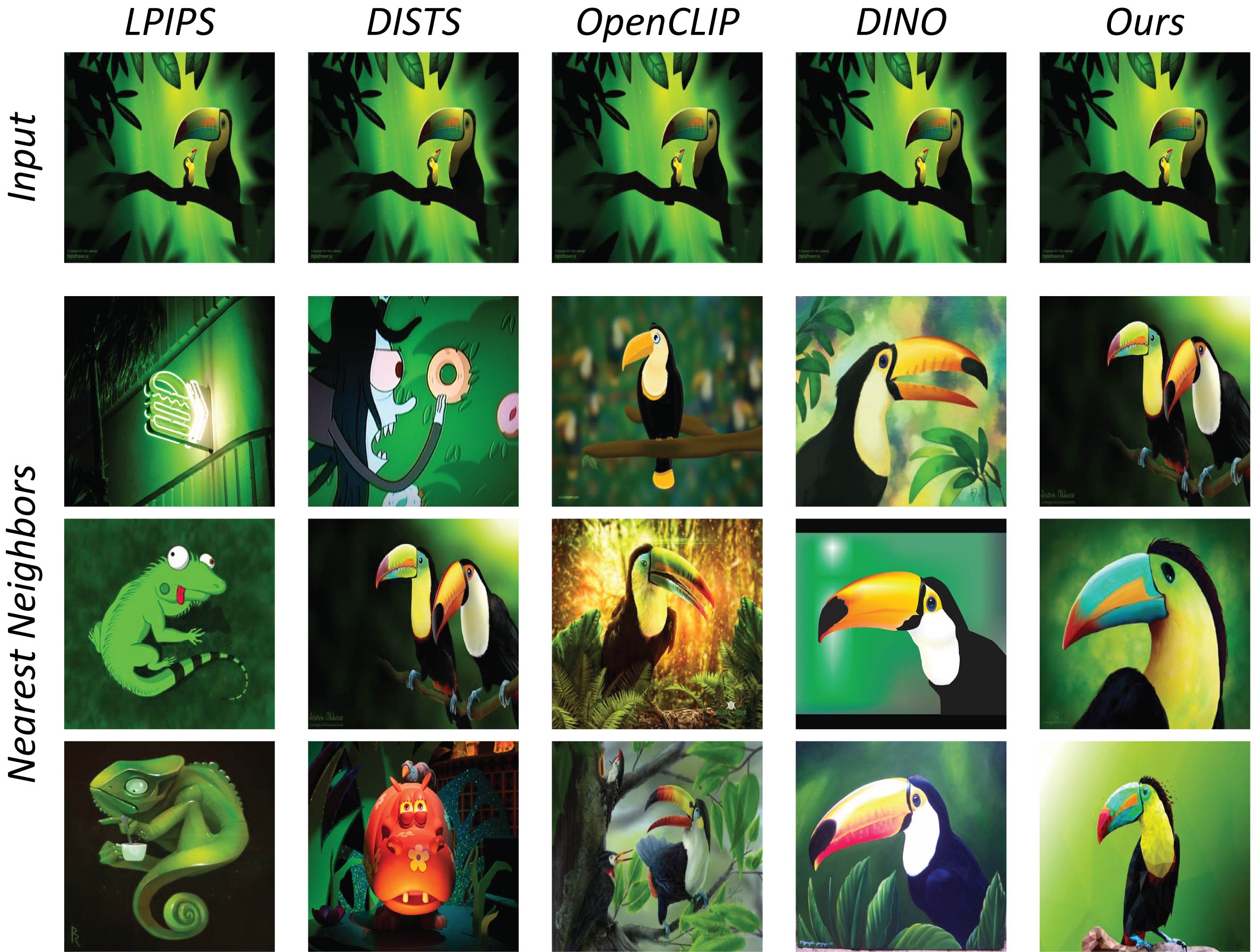 We perform a nearest neighbor search on the ImageNet-R and COCO datasets using different metrics.