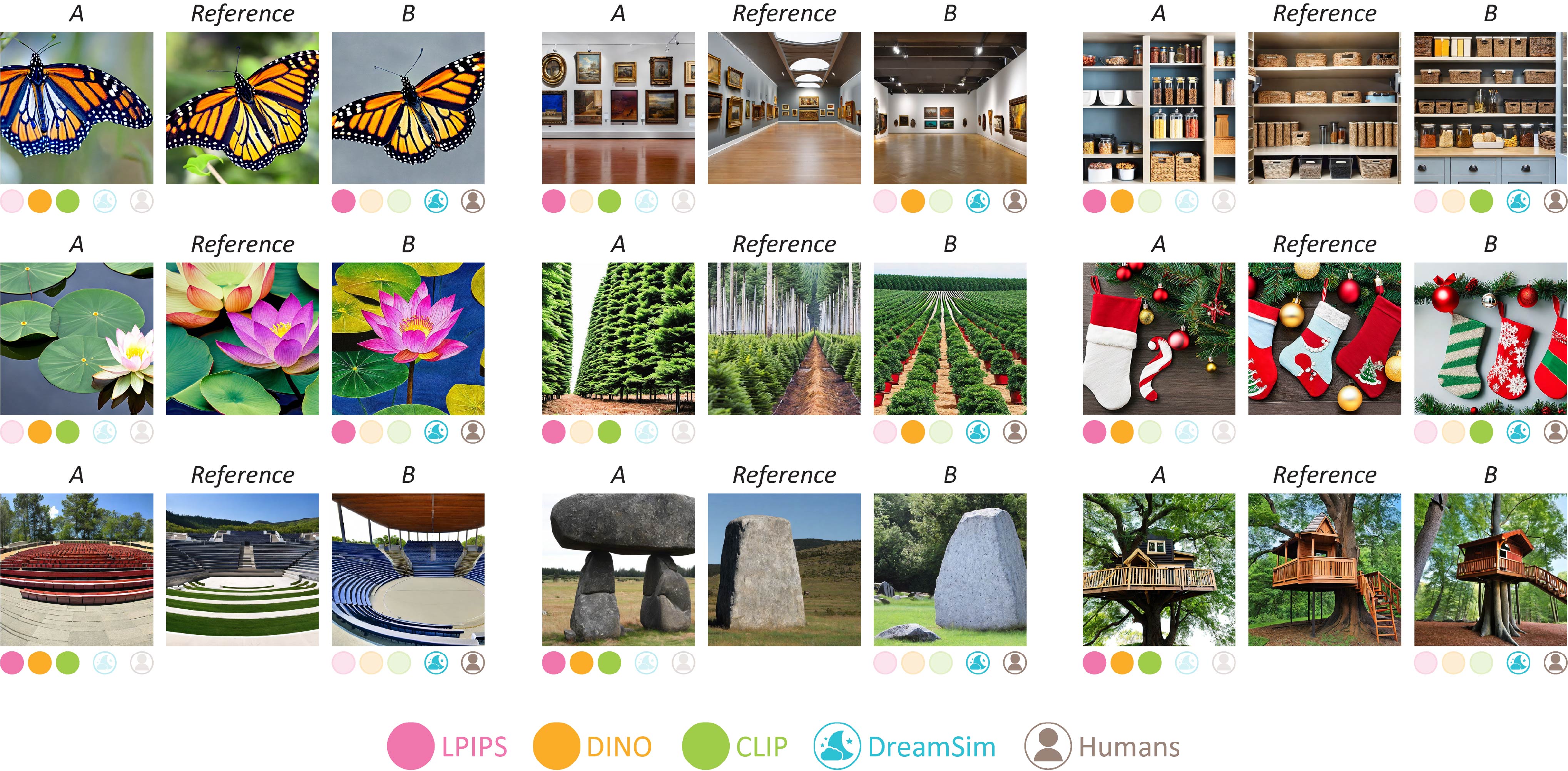The dots below each image indicate which image is considered most similar to the reference by humans vs several existing metrics and our new metric, DreamSim.
